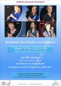 Ayant travaillé en « collectif » pendant ces dernières années, c’est par de nombreuses pièces d’ensembles qu’elles proposent leur concert de fin d’études le 31 mai à 19h à l’auditorium. Elles seront accompagnées de Madeleine, Noëlle, Sylvie et Nicolas.
